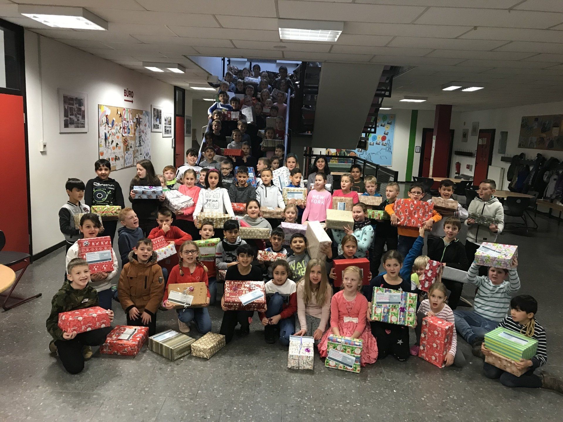 Bei der zum ersten Mal durchgeführten Weihnachtstombola herrschte große Nachfrage nach den Losen. Jedes Kind konnte für 1 € ein solches Los erwerben. In der letzten Schulwoche vor den Weihnachtsferien wurden dann viele schöne Preise vergeben. Unsere hilfsbereiten Praktikanten Jonas Kann, Lilli Beisenherz, Agnesa Rama und Liese Wagner haben fleißig als Weihnachtselfen geholfen und die Preise an die Gewinner verteilt. Die Hauptpreise haben Sophia 4b, Licia 1c und Shayla 4c gewonnen. Der Erlös der Tombola wird für einen guten Zweck gespendet. Organisiert hatte das Ganze Frau Scholl. Vielen Dank dafür!